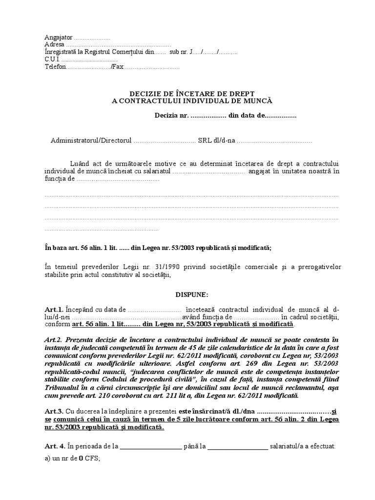 Decizie De Incetare De Drept A Contractului Individual De Munca