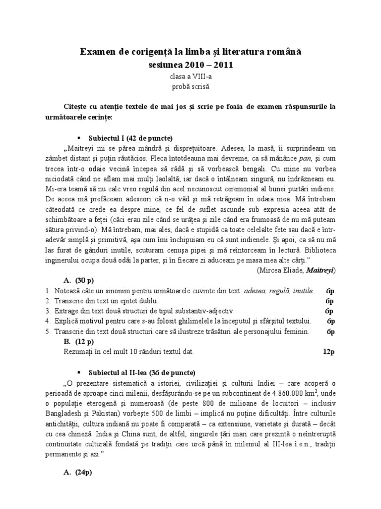 Examen De Corigenţă La Limba Si Literatura Romană