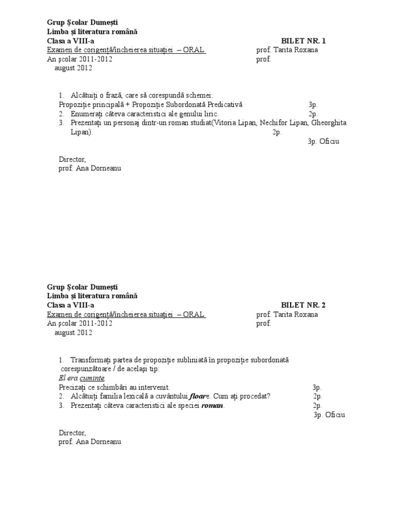 Examene Corigenţă Clasa A Viii A Scoala Gimnaziala Nr 1 Hulubesti