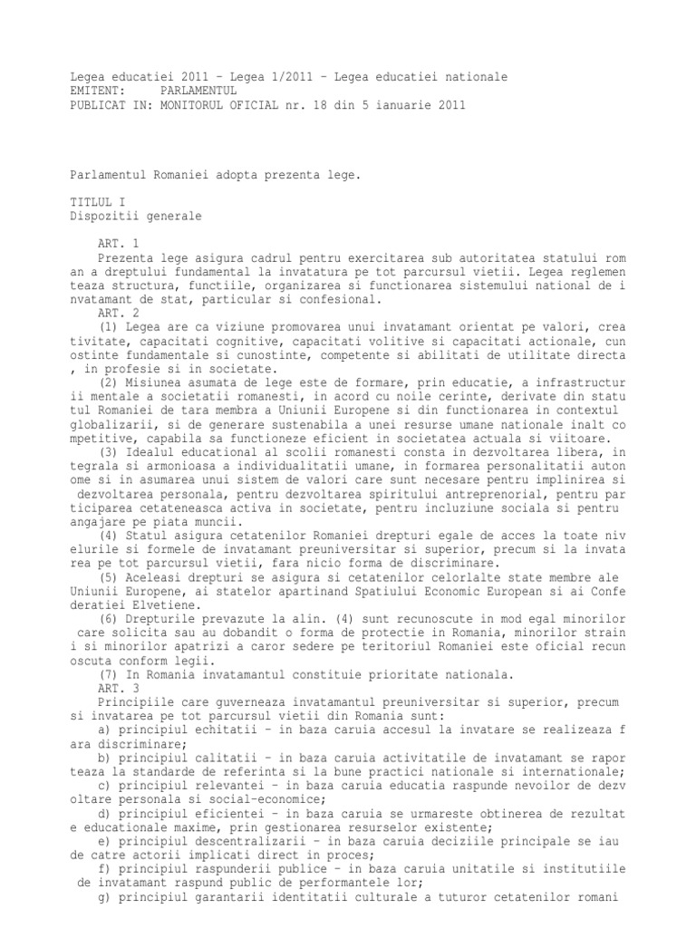 Legea Educatiei Nationale 2011 Monitorul Oficial