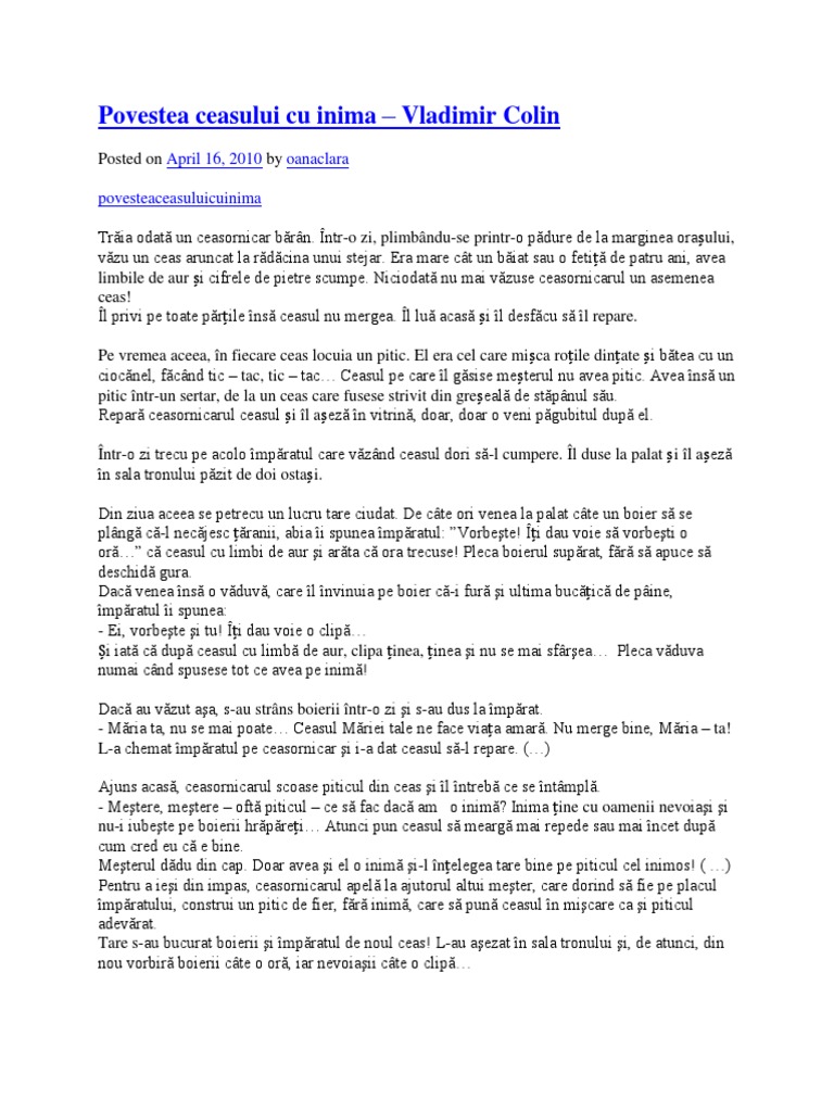 Povestea ceasului cu inima de vladimir colin. Povestea crocodilului care plange. Un ceasornicar batran a gasit un ceas de aur si pietre scumpe care nu functiona deoarece n avea pitic ceasurile pe timpul acela erau puse in miscare de un pitic cu ciocanel. Zece povesti pitice vladimir colin editura regis. Povestea ceasului cu inima.